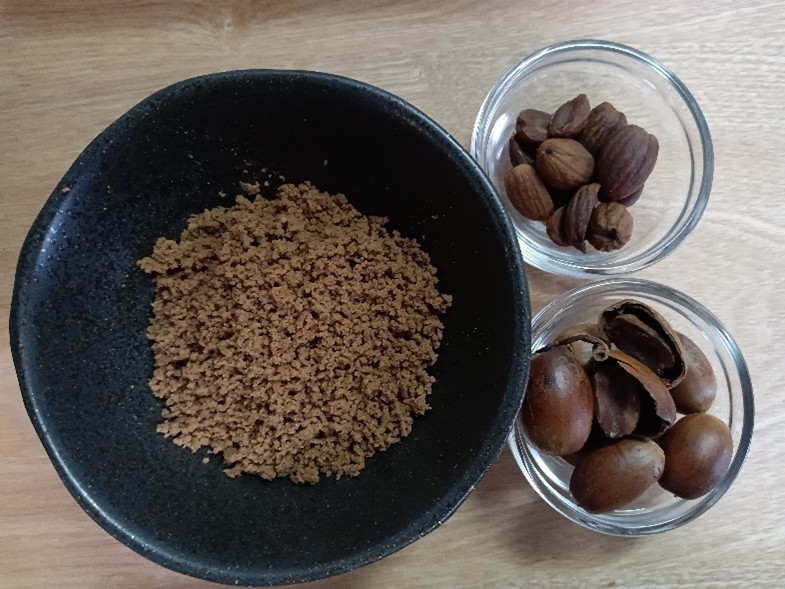 他地域ではアクの少ないシイが一般的ですが、王滝村で主に利用されるどんぐりはアクが強いものの殻が薄く加工しやすい王滝村に多く自生するミズナラとコナラです。現在はその独特のおいしさを活かしたパンや焼き菓子など多様な料理に利用されています。