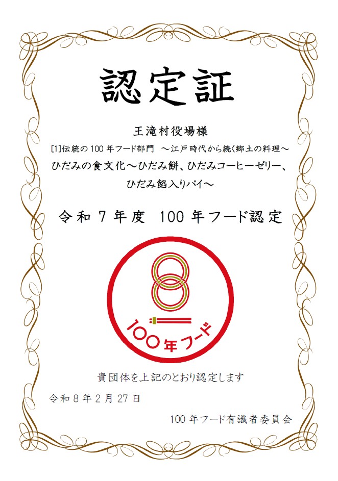 ひだみの食文化は、文化庁の食文化機運醸成事業「100年フード」において、令和7年度「伝統の100年フード部門~江戸時代から続く郷土の料理~」に認定されました。
